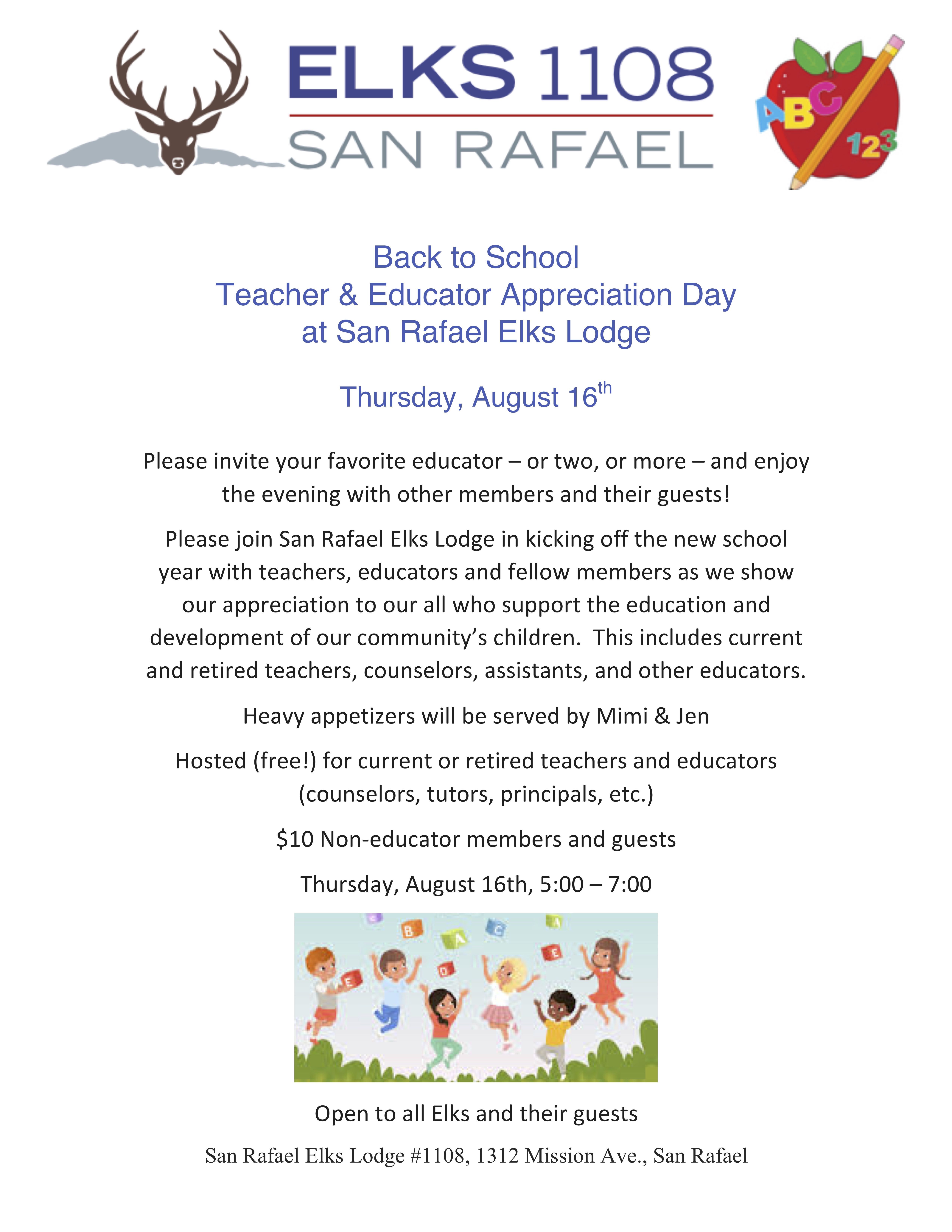 Please join San Rafael Elks Lodge in kicking off the new school year with teachers, educators and fellow members as we show our appreciation to our all who support the education and development of our community’s children. This includes current and retired teachers, counselors, assistants, and other educators.