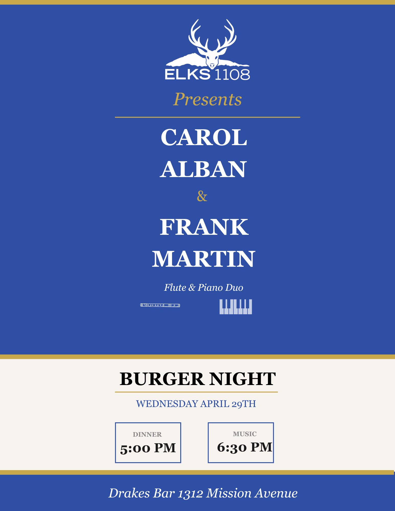 Flutist Carol Alban, principal flutist of the Bay Area Chamber Symphony and a composer the New York Times called "sweetly angular," is joined by keyboardist Frank Martin — who has played with Stevie Wonder, Sting, Herbie Hancock, Paul Simon, and Santana and spent 25 years at Carnegie Hall with Sting's Rainforest Band. Two world-class artists. One night. Be there.